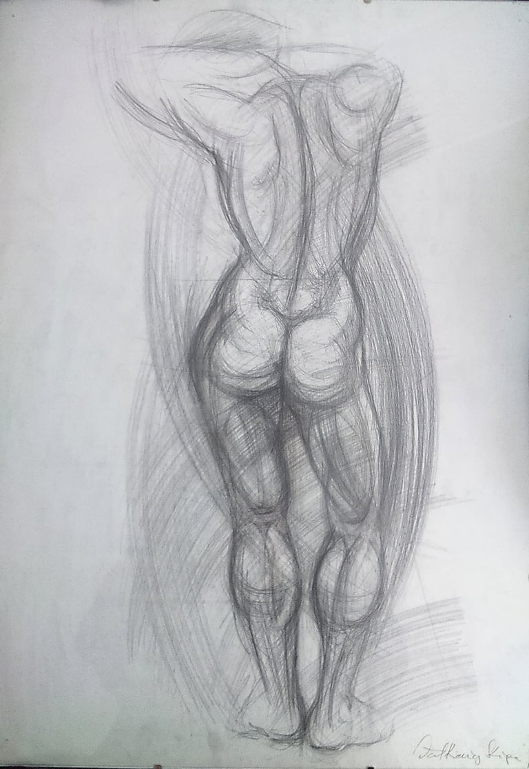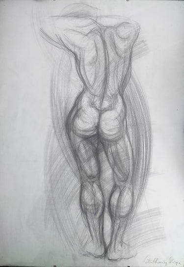 A graphite drawing of a woman standing with her back to the viewer serves as the perfect stage for exploring the expressive power of line. In this kind of work, the body is less an object and more a structure of rhythms—a constellation of curves which translates into marks on paper.